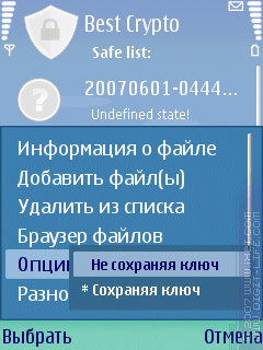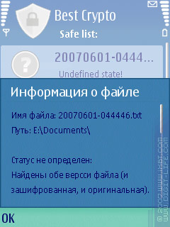 Второй вариант — для особо важных файлов. Они добавляются в специальный список «Safe list», который и является, собственно, главным окном программы. Каждому добавленному файлу назначается один из трех значков: «родной» значок — для незащифрованных файлов, «замок» — для зашифрованных, «вопрос» — для неопределенных. Последнее может возникнуть в случае появления каких-либо коллизий, например, файл существует сразу в двух вариантах (в зашифрованном и незашифрованном), или вообще был удален/перемещен/переименован.