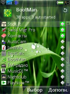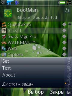 Для помещения требуемой программы в список автозагрузки нужно выбрать ее из списка и включить, выбрав пункт «Set». После выбора список пересортировывается: автоматически запускаемые приложения ставятся в начало списка, и отметка автозагрузки меняет цвет. Здесь имеется две неаккуратности. Во-первых, постоянно светится кнопка «Выбор», которая не работает (это на M600/W950, а на P990 все нормально). Во-вторых, название «Set» при выборе уже активированного приложения не изменяется на что-нибудь вроде «Disable» — это как-то не эстетично.