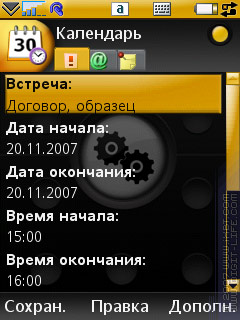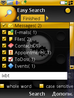 Поиск ведется в следующих категориях: SMS-сообщения, E-mail, Файлы, Контакты, Напоминания, Дела, События, Встречи и Годовщины. Для ускорения процесса поиска можно отключить просмотр категорий, в которых точно искать не нужно. Время поиска при 200 контактах, 20 SMS, 20 E-mail, 20 записях в календаре и с картой 1Gb составляет примерно 9 секунд. Если для этой же ситуации отключить поиск по файлам, получается 5 секунд, а если отключить еще сообщения и контакты - 2 секунды. Вполне приемлемые результаты; программа поиска для S60 выдает идентичные показатели.
