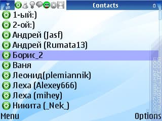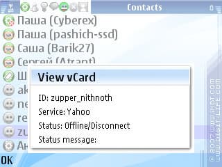 Вернемся к списку контактов, и посмотрим, какие еще возможности предоставляет меню «Options», закрепленное за правой софт-клавишей. Помимо удаления и переименования контакта, отправки файлов и сообщений, здесь присутствует пункт «Show info», назначение которого, как понятно из названия, – отображение информации о нужном нам пользователе. А вот информация эта крайне скупа – помимо ника и ID, видны статус контакта и протокол. Нижняя строчка – «Status message», однако показывает статус-сообщения пользователей она только для протокола Yahoo.