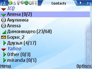 Из пункта главного меню «View» можно сконфигурировать размер интерфейса списка контактов и шрифта в меню чата. На разных смартфонах программа будет смотреться по-разному: к примеру, на экранах 352/416 лучшим вариантом будет маленький размер - помимо того, что все отображается четко, это позволяет реально увеличить количество отображаемых в меню контактов. А вот на «горизонталках» с экраном 320/240 точек оптимальным размером шрифта является средний, потому что увеличение элементов интерфейса ни к чему хорошему не ведет, кроме потери четкости, а на экране помещается все то же самое, только более мелкое.