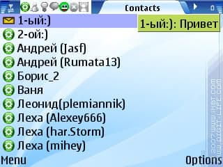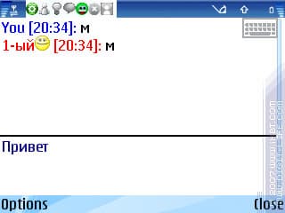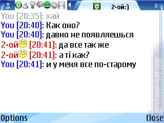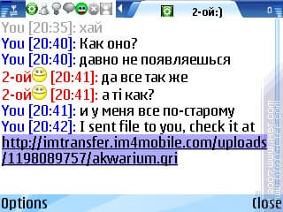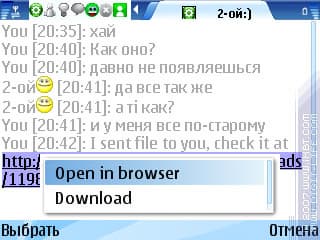 Допустим, кто-то отправил вам файл с аналогичной программы. Теперь задача – скачать его. И вот тут мы плавно переходим от одной темы к другой: выделению текста с экрана. К сожалению, делать это герой данного обзора не умеет, и при получении ссылки нам дается на выбор два варианта: либо скачать ее встроенным загрузчиком, либо открыть в браузере. И если для файлов первый вариант вполне сойдет, то при получении ссылки на страничку, например, придется открывать ее в браузере. Вот тут-то ждет еще один неприятный сюрприз: на смартфонах с Symbian OS 9.1, где присутствует два браузера – «Интернет» и «Услуги», «IM+» использует как раз рудимент старых редакций s60 – предназначенные для wap-страничек «Услуги». Согласитесь, не очень удобно.