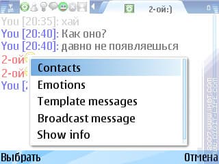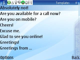 Еще одной интересной возможностью программа обзавелась в версии 7.00 – это отправка шаблонов. Последние можно вызвать с помощью левой софт-клавиши непосредственно из окна чата; количество их довольно велико (естественно, все они на английском), однако любой шаблон можно удалить, равно как и добавить свой.