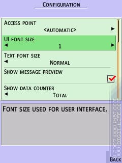 Примерно та же ситуация и на UIQ (посмотрим на примере Sony Ericsson M600i, UIQ 3.0). Расположим скриншоты так же, как и для предыдущего примера: справа все варианты для системного шрифта, слева — примерно соответствующие им 4 варианта для встроенного шрифта. Пропуски, разумеется, означают, что такого размера для встроенного шрифта попросту не существует.
