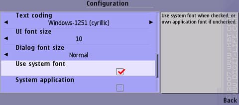 Долго ли ситуация продержится в том виде, в каком она есть сейчас находится, точно неизвестно. Возможно, переключатель сделают пунктом настроек (...а вот и вариант ответа). Так или иначе, начиная с версии 2.86 (ProfiMail), 2.18 (Jukebox), 0.37 (Slick) и 1.20 (X-plore) в программе имеется переключатель, позволяющий включать и выключать использование встроенного шрифта. Правда, в меню такого пункта нет, и для того, чтобы переключить шрифт, нужно забраться в «Меню — Далее немного по-разному — О программе» (в англ. варианте — «Menu — ... — About»), и последовательно нажать клавиши «8-0-0», то есть, вбить код «800». Если версия программы не младше указанных, изменения произойдут незамедлительно, хотя «яркость» изменений будет зависеть от используемого стороннего шрифта, если он вообще вами используется.