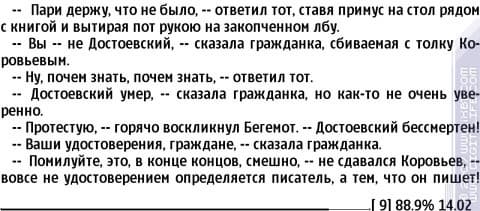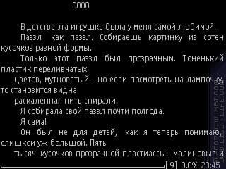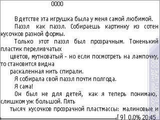 Любой текст открывается в считанные секунды, поиск работает превосходно. Переход на часть текста позволит быстро найти нужный момент. После закрытия книги, создается файл формата *.qri, который хранит настройки данного текста и положения в нем.