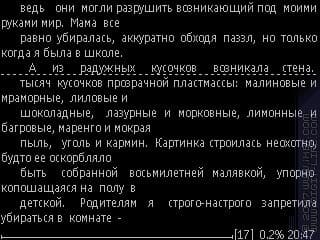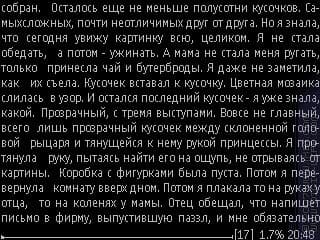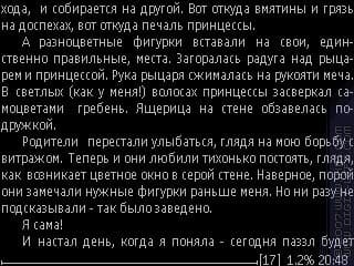 А неудобство — клавиши. Вот, где сильно сказывается неумение программы переназначать клавиши. Те, что выбираются программой для пролистывания, находятся в таких местах, которые не очень удобны для использования, если держать аппарат одной рукой при чтении. Держать же смартфон левой рукой при чтении — это вообще почти невозможное дело, разве что включив автопролистывание.