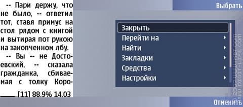 В спокойных местах лучше использовать плавную прокрутку (чем выше скорость – тем медленнее прокручивается текст, скорость также можно менять и во время чтения, нажатием кнопки «влево» или «вправо», активизировать прокрутку можно нажатием по центру).