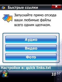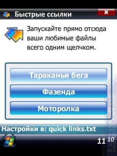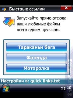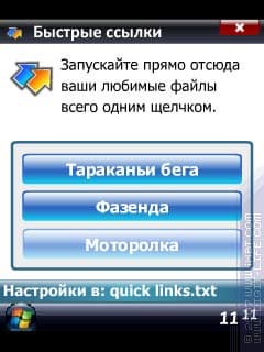 Присутствует возможность работы с тремя контактами и тремя ссылками. Для двух функций в меню программы имеются соответствующие пункты, которые так и названы: «Ссылки» и «Контакты». Первое — три ссылки на что угодно, прямые ссылки на файлы. В параметрах — путь к файлу и название для подписи на кнопке.