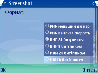 Форматов для сохранения изображения, в принципе, хватает для любых требований: это три степени сжатия JPEG, три варианта PNG, 28- и 8-битные BMP и MBM. Честно говоря, это даже избыточный набор, если нет проблем с местом на карте памяти или в памяти смартфона.