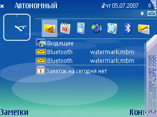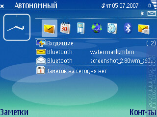 Внутри этого файла («watermark.mbm») две картинки *.BMP нужного размера (по-умолчанию, после установки там лежит файл, заточенный под разрешение 352х416, будьте внимательны!). Выравнивается картинка по верхнему левому углу, так что если у вас аппараты с другими разрешениями дисплея (240х320, 320х240, 176х208, 208х208), переделайте этот файл: удалите из него картинки, и поместите свои. Например, для Nokia E61 мы заменили те, что были, такими: