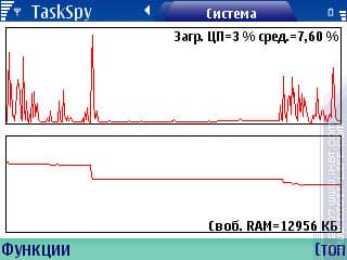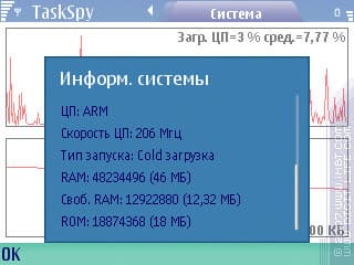 Последняя, пятая закладка, — «Система». Это самый «аккуратно оформленный» раздел программы. Состоит из двух областей: область загрузки CPU (процессора) и область отображения расхода памяти RAM. Для каждой отображается цифровое значение, по ходу дела рисуется график, картинка обновляется раз в секунду. Такая визуальность полезна при отслеживании работы длительных процессов, и большинству пользователей почти никогда не пригодится, так как будет невозможно одновременно и смотреть в это окно, и выполнять какие-то действия с аппаратом, а без этого визуализация теряет всякий смысл.