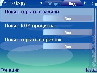 Три закладки: «Общие», «Вид» и «Системные». Первая — включение и выключение функций «Подтверждение действий» и «Показ panic-сообщений» (ошибки при работе системы). Вторая — показать/скрыть ROM-процессы, Hidden-приложения и Hidden-задачи (скрытые). Третья — пока не особо нужна, поскольку перечисленное в ней на версии для S60v3 не работает: установка горячих клавиш и частота сжатия памяти.