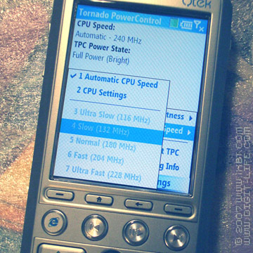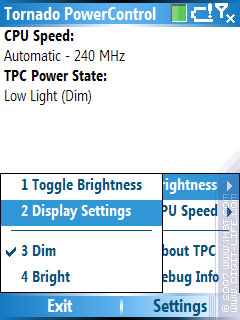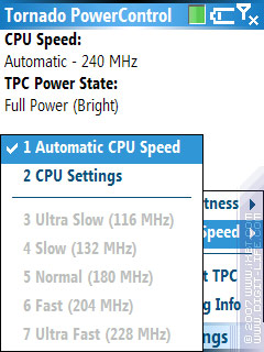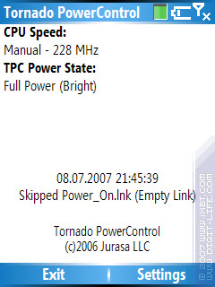 Собственно, какие основные функции программы? Первое - держать частоту. Дело в том, что HTC Tornado, когда уходит в режим «Power Saving» (визуально - вся подсветка погасла), сбрасывает частоту. А «Tornado PowerControl» как раз настроена на то, чтобы при выходе из этого режима восстанавливать частоту в заданную. Иногда она, правда, этого не делает - видимо, какой-то баг. Кстати, начиная с какой-то версии программа переключает частоту дважды: сначала в 180 MHz, а потом - в выставленную. Сделано это для повышения стабильности работы. Ну а вторая задача - переключать режимы работы подсветки; с нею программа справляется без проблем.