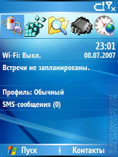 Поддерживается два режима яркости дисплея: обычный (стандартный, флаг D0) и экономный (яркость понижена, флаг D3). Штука эта весьма нужная, так как управление яркостью в смартфонах на WM5 отсутствует, что, например, чтение книг в темноте делает весьма неприятным занятием, так как подсветка слишком яркая. Или другое: чувствуете, что аккумулятор скоро сядет, сбавили подсветку - подольше протянет.