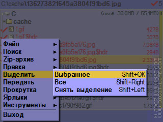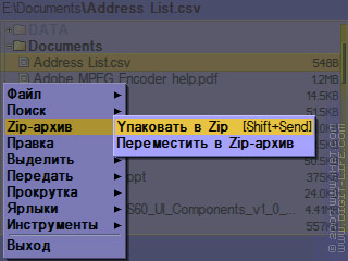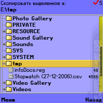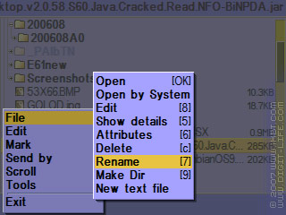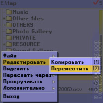 Во-первых, это стандартные функции: копирование, вставка, перемещение, удаление, переименование. Некоторые неудобства связаны с функцией копирования. Дело в том, что в меню отсутствует такая функция как «Paste» (вставить). Во-первых, пользователю придется самому догадываться, как именно работат вставка: мало кому придет в голову, что «Copy» можно нажимать в любое время, а не «стоя» на копируемом файле. Во-вторых, случайно нажмете «Ок» по привычке для выбора папки — тут-то вам и придется наслаждаться процессом копирования туда, куда вы, возможно, копировать ничего и не собирались. С переименованием тоже проблемы: программа понимает файлы, у которых имя длиннее 64-х символов, но переименовывать их правильно не может — имя будет обрезано до 64 символов. Есть и интересные моменты: наличие и количество выделенных файлов всегда отображается вверху окна менеджера.