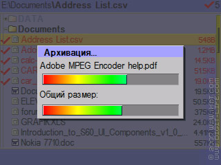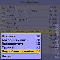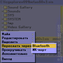 Самая приятная возможность для многих пользователей — пересылка любых файлов через Bluetooth или ИК-порт. Стандартный менеджер, да и многие другие менеджеры испытывают определеные трудности при попытке передать защищенные объекты, к которым относятся поголовно все SIS-файлы, JAR-файлы, кое-что из музыки, защищенное авторскими правами, и так далее. Здесь с этим просто: выделил, нажал кнопку, отправил. Не нужно никаких архивирований и прочих шаманских танцев с бубном. Для пересылки по bluetooth еще и горячая главиша есть — конпка «Send» (зеленая трубка).