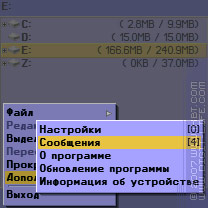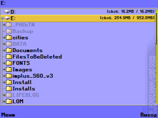 Приятно, что почти каждому действию в меню назначена кнопка (от 0 до 9); жаль, что нельзя переназначить — тем, кто привык к другой раскладке, придется переучиваться. Настройки программы: размер шрифта для просмотра файлов в режиме «fullscreen», отображение скрытых/системных файлов и папок, отображение ROM-раздела, выбор цвета оформления (это вообще страшная редкость в программах для Symbian). Скрытые папки и файлы отображаются верно — то есть, иначе (засветлены), нежели обычные. Кому-то покажется полезной функция «Device info», где отображается память вся/занятая и частота процессора.
