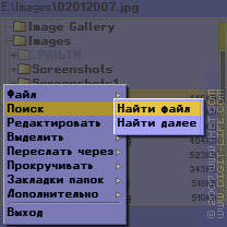 Имеется функция поиска файлов. Максимально упрощена, только поиск по маске. Результаты поиска выводятся отдельным окном, меню для найденных файлов тоже чуть измененное. Дополнительно сделана опция «Найти далее», которая на самом деле представляет из себя просто переход в окно с результатами поиска.