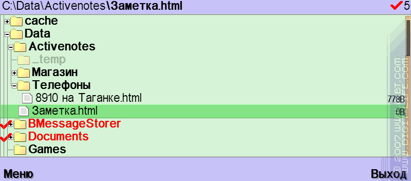 Программа поддерживает работу с папкой «Входящие» в сообщениях.Можно просматривать только папку «Входящие». Но, если подумать: часто ли вы из входящих что-то перекладываете в иные папки, особенно если это — файлы, принятые по Bluetooth/IrDA? Тем более, что программе все равно, где лежит файл: в папке «Входящие» или в «Мои папки». Кроме того, здесь есть две очень полезные вещи: первая — открыть файл прямо внутри сообщения, без извлечения и сохранения. Вторая — функция «переместить»: при этом и файл копируется, и входящее сообщение уничтожается.