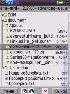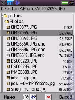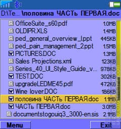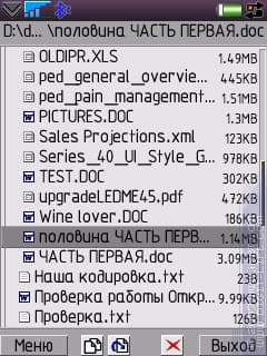 Один из очевидных минусов — мелковато все — теперь решается отключением встроенного шрифта или, кому достаточно, его масштабированием. Плюсы вполне очевидны: удобное управление, отправка файлов через Bluetooth/IrDA, в том числе и защищенных объектов, просмотр и редактирование текстовых файлов, поиск файлов и текста, просмотр документов *.DOC/*.DOCX, просмотр архивов ZIP/RAR, HEX-вьювер/редактор, работа с файлами в сообщениях, прослушивание аудио, просмотр видео (легкое preview), цветовые схемы.