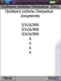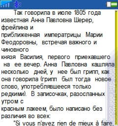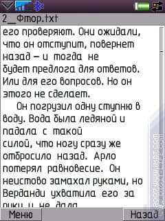 Для этого встроенного просмотрщика можно в настройках изменять размер шрифта (три варианта). Лучше сразу ставить максимум, хотя и средний вполне читабелен. Навигация по файлу заслуживает некоторых похвал: PageUg и PageDown работают быстро и красиво, так что «проматывание» даже довольно длинных текстов не вызовет затруднений. Есть небольшой глюк: прокрутка текста работает «не в строку», то есть, не ровно по строчкам пролистывает. Отсутствуют функции «в начало» и «в конец» — еще один пример того, что разработчики не очень спешат для UIQ создать что-то не менее серьезное, чем для S60: в той версии уже работают эти функции. Режим «fullscreen», о котором говорилось выше, работает и для просмотра текстов.