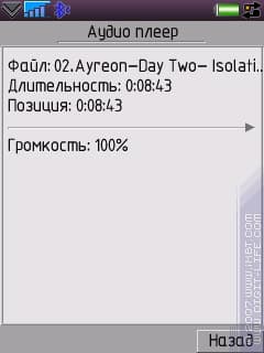 Далее: начиная с версии 1.15 в программе появился встроенный мини-аудиоплеер. Поддерживаемые форматы — MP3, AAC, RNG (рингтоны Nokia), MIDI, WAV. Проверялись еще OGG, AMR и WMA. Первый открывается мини-плеером, но не воспроизводится, а второй и третий не открываются мини-плеером, они открываются системой. Внутри мини-плеера все очень просто: индикатор прокрутки, общее время, текущее время. Можно прокручивать мелодию вперед-назад, регулировать громкость, есть возможность включать паузу. Пока мелодия воспроизводится, с телефоном можно выполнять какие-либо другие действия, при этом дерготни и тормозов обнаружено не было.