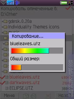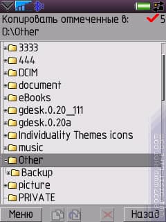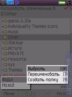 Во-первых, это стандартные функции: копирование, вставка, перемещение, удаление, переименование. Некоторые неудобства связаны с функцией копирования. В меню отсутствует такая функция как «Paste» (вставить). Во-первых, пользователю придется самому догадываться, как именно работает вставка: мало кому придет в голову, что «Copy» можно нажимать в любое время, а не «стоя» на копируемом файле. Во-вторых, случайно нажмете «Ок» по привычке для выбора папки — тут вам и придется наслаждаться процессом копирования туда, куда вы, возможно, копировать ничего не собирались. Есть и интересные моменты: наличие и количество выделенных файлов всегда отображается вверху окна менеджера.