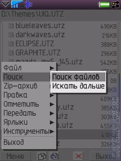 В наличии функция поиска файлов. Максимально упрощенная, только поиск по маске. Результаты поиска выводятся отдельным окном, меню для найденных файлов тоже чуть измененное. Дополнительно сделана опция «Найти далее», которая, на самом деле, представляет собой переход в окно с результатами поиска.