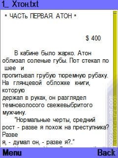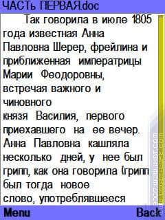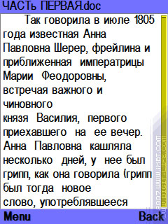 Второе — чтение вордовских файлов. Очень радует понимание русского языка. Форматирование, естественно, не поддерживается, из документа выделяется только текстовая составляющая. Скорость открывания документов такова: файл 1.2 Мб, состоящий только из текста, открывается за 20 сек, файл размером около 3 Мб (тоже только текст) — около 50 секунд.