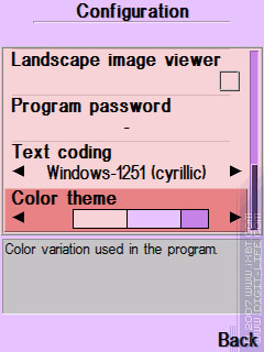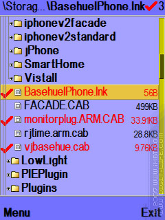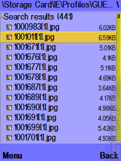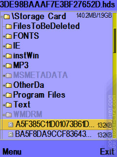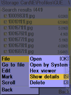 Приятно, что почти каждому действию в меню назначена кнопка (от 0 до 9); жаль, что нельзя переназначить — тем, кто привык к другой раскладке, придется переучиваться. Настройки программы: сортировка (имя, дата, расширение, размер), размер шрифта и кодировка для просмотра файлов, режимы «fullscreen» и «landscape» (просмотр файлов), пароль на запуск программы, отображение скрытых/системных файлов и папок, выбор цвета оформления (это вообще страшная редкость в программах для смартфонов). Скрытые папки и файлы отображаются верно — то есть, иначе (засветлены), нежели обычные. Кому-то покажется полезной функция «Device info», где отображается память вся/занятая и, в отличие от симбиановской версии, не частота процессора, а OwnerName.