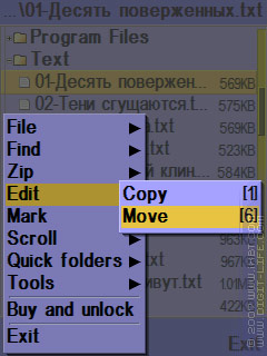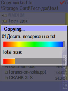 Во-первых, это стандартные функции: копирование, вставка, перемещение, удаление, переименование. Некоторые неудобства связаны с функцией копирования. Дело в том, что в меню отсутствует такая функция как «Paste» (вставить). Во-первых, пользователю придется самому догадываться, как именно работат вставка: мало кому придет в голову, что «Copy» можно нажимать в любое время, а не «стоя» на копируемом файле. Во-вторых, случайно нажмете «Ок» по привычке для выбора папки — тут-то вам и придется наслаждаться процессом копирования туда, куда вы, возможно, копировать ничего и не собирались. С переименованием тоже проблемы: программа понимает файлы, у которых имя длиннее 64-х символов, но переименовывать их правильно не может — имя будет обрезано до 64 символов. Есть и интересные моменты: наличие и количество выделенных файлов всегда отображается вверху окна менеджера.