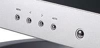 Панель управления линейки тоже отличается от мониторов других классов. Металлические кнопки хорошо сочетаются с остальными элементами конструкции. Кроме того, изменился и индикатор активности монитора: отдельный светодиод на передней модели заменил расположенный под кнопкой выключения питания, к тому же, и цвета поменяли — теперь при работающем мониторе он светится синим. Вроде пустяки, но красиво. Число кнопок не изменилось, а вот их назначение — да, поскольку поменялась логика управления и меню — последнее стало иерархическим, так что пришлось предусмотреть специальную кнопку для его открытия или входа в подменю. Еще одна кнопка выполняет автоматическую настройку, а также переключает монитор между входами — делать это с панели удобнее, чем через меню как ранее. Кнопки «<» и «>» теперь вне меню работают как цифровой регулятор громкости, заменивший применявшийся ранее аналоговый. А еще звуку посвящен отдельный пункт в меню — кроме громкости можно также настраивать также тембр высоких и низких частот и баланс. Практической пользы от этого, на мой взгляд, никакой: все настройки применимы только к встроенным динамикам, а их что настраивай, что не настраивай. Выхода на наушники новые мониторы лишились, что мне очень не понравилось — привык уже. Впрочем, по сути, это единственная моя претензия к дизайну монитора.
