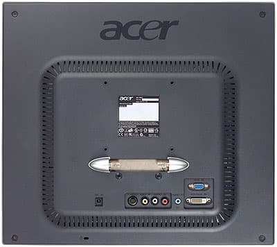 В отличие от пластмассовых подставок мониторов других линеек, эта сделана не сплошной, что, вместе с небольшой толщиной основной части и узкой окантовкой матрицы производит впечатление чего-то легкого и ультрасовременного. Легкость эта, обманчива: монитор весит на полкило больше, нежели AL922/AL1911m — 6 кг (но взвешивать его никто не будет, так что визуальные ощущения важнее). На столе монитор занимает меньше места, чем другие модели: его габариты вместе с подставкой — 423×422×172 мм, что несравнимо с ЭЛТ-моделями даже с меньшей диагональю. Можно лишь посетовать, что для обеспечения максимальной компактности блок питания оставлен внешним. С другой стороны, Acer и ранее не очень охотно использовал встроенные блоки питания, что наряду с небольшими минусами (больше элементов, чуть сложнее подключение) имеет и огромный плюс — в случае выхода БП из строя достаточно просто заменить его, а не тащить в сервис-центр весь монитор.