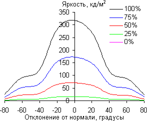Отметим плавное уменьшение яркости при отклонении от перпендикуляра к экрану в горизонтальном направлении, при этом графики не пересекаются во всем диапазоне измеряемых углов. Заметно быстрее падает яркость при отклонении в вертикальном направлении. При отклонении в диагональном направлении поведение яркости оттенков имеет промежуточный характер между вертикальным и горизонтальным направлениями, за исключением яркости черного поля, которая начинает резко возрастать уже при 20°-30° отклонения от перпендикуляра к экрану. Если сидеть от экрана на расстоянии 50-60 см, то черное поле по углам будет заметно светлее, чем в центре. Контрастность в диапазоне углов ±82° в случае отклонения по диагонали приближается к отметке 10:1 и как минимум в одном направлении опускается за отметку 10:1 при 61°.