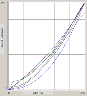 Возвращаясь к нашей методике тестирования, оценим полутона, для чего запустим HTML LCD-тест. На нижних графиках совсем не видны все темные полутона, зато наблюдаются светлые от 252.252.252 и темнее.