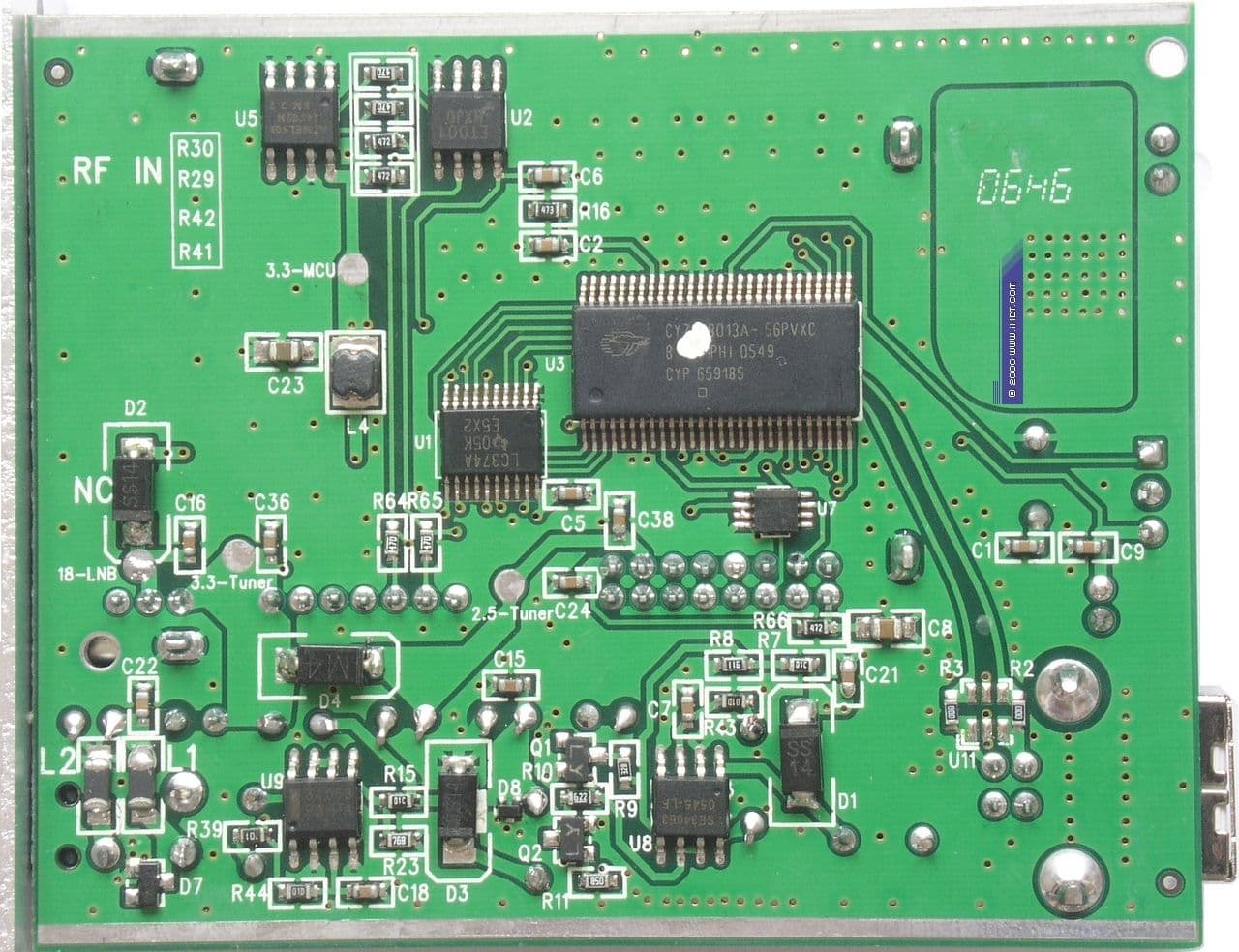 Согласно имеющейся на момент выхода обзора Nextorm NCS120 информации, за управление LNB и работа с протоколом DiSEqC отвечал микроконтроллер TI MSP430f2121 от Texas Instruments Incorporated, действительно, имеющийся на предыдущих ревизиях. На фото плата ревизии V2.0(B02) от TV878DS USB.
