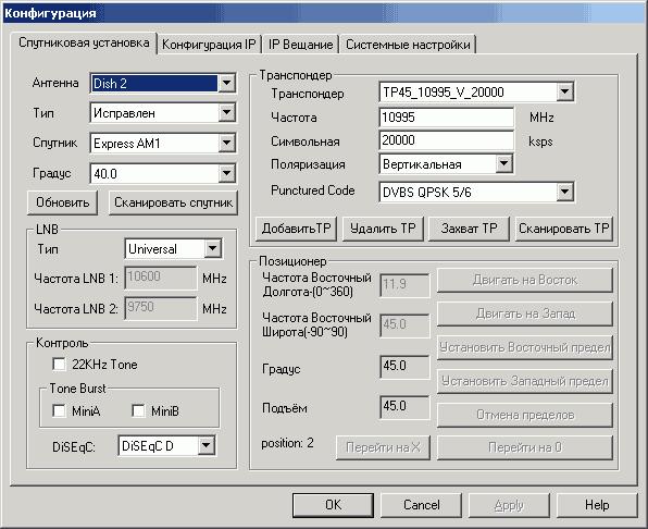 Раздел Спутниковая установка содержит выбор спутников (список сортируется не по координатам, а по алфавиту), настройки LNB, DiSEqC-переключателей, позиционеров (в случае использования таковых) и транспондеров (допускается добавление, удаление и захват). Возможен как поиск всех каналов выбранного спутника, так и сканирование произвольного транспондера.