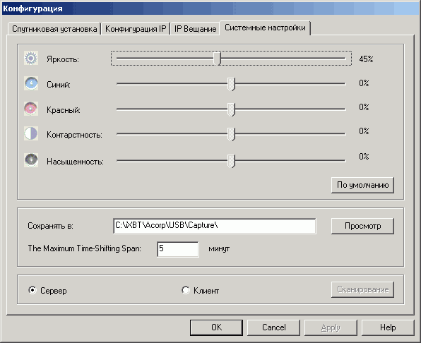 Последний раздел Системные настройки посвящён видеопараметрам. Несмотря на наличие контраста и насыщенности, изменять позволено только яркость. Кроме того, в этом разделе можно выбрать папку для записи, время буфера в режиме отложенного просмотра (запускается кнопкой Пауза на панели) и выбор режимов клиент/сервер.