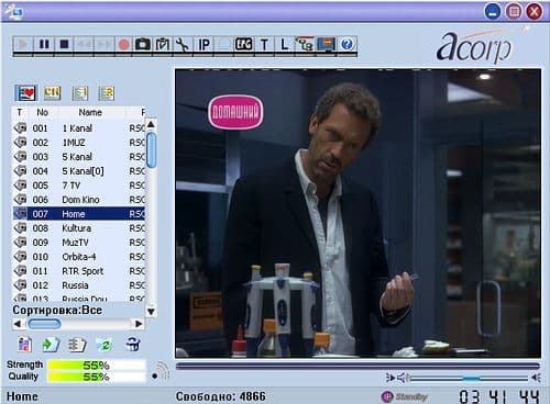 Программисты DVBworld не остались в долгу. Они выпустили штатное ПО, отвечающее большинству современных требований, реализовав, к тому же, поддержку русского языка. В обзоре Nextorm NCS120 мы уже познакомились с этой программой (заодно получив представление о возможностях аппаратно идентичного Acorp TV878DS PCI), однако без достойных упоминания изменений не обошлось.