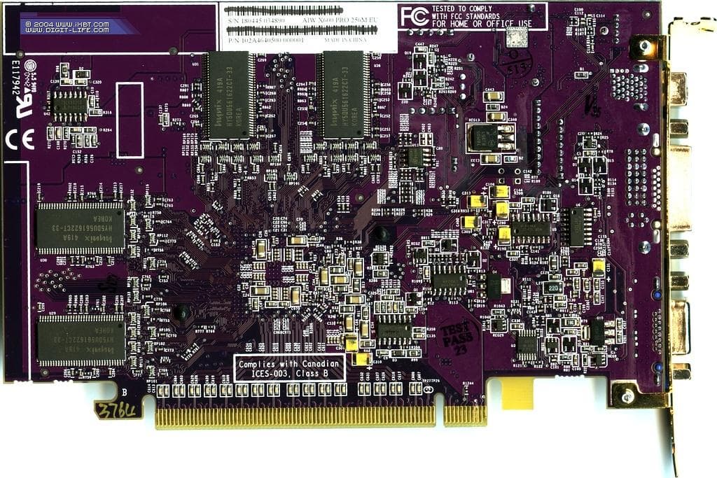 | Карта имеет интерфейс PCI-E 16x, 256 МБ памяти DDR SDRAM, размещенной в 8 микросхемах на лицевой и оборотной сторонах PCB. Микросхемы памяти (TSOP) произведены Hynix Semiconductor. Время выборки у микросхем памяти 3.3ns, что соответствует частоте 300 (600) МГц, на которой память и работает. Частота работы GPU — 400 МГц. Шина обмена с памятью — 128 бит. | ![]() |