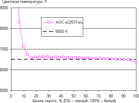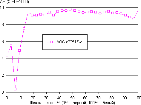 Близкий к черному диапазон можно не учитывать, так как в нем цветопередача не так важна, а погрешность измерения цветовых характеристик высокая. Цветовая температура равна стандартным 6500 К. ΔE относительно большое, но меньше 10 — значения, выше которого, цветопередача считается неудовлетворительной. ΔE повышает избыток зеленой компоненты, что приводит к некоторому повышению яркости при том же энергопотреблении. Тем не менее, на большей части шкалы серого ΔE имеет незначительную вариацию, и это обуславливает хорошую визуально воспринимаемую цветопередачу.