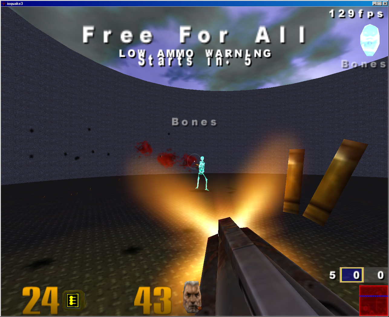 Для выполнения поставленной задачи мы использовали игру Quake 3 Arena с игровым сервером OSP. Выбор игры был обусловлен несколькими обстоятельствами: во-первых, и это самое главное, в свое время автор провел некоторое время за этой игрой, что позволило существенно сократить период обучения, достаточно было восстановить подзабытые навыки (не то чтобы экстраординарные); во-вторых, в игре доступен одиночный режим; в-третьих, игра поддерживает частоту обновление порядка 144 Гц и выше; в-четвертых, с сервером OSP доступна некоторая статистика, позволяющая количественно оценить эффективность игрока. Игра была настроена на запуск простой (учебной) сцены с одним виртуальным противником, игроку даровалась неубиваемость и максимальное количество боеприпасов, матч велся до пяти побед и игроком применялся только один вид оружия.