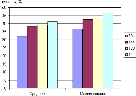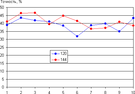 Чем выше Accuracy, тем выше процент попадания, то есть тем выше эффективность игрока. Отметим, что Quake 3 Arena запускалась в оконном режиме, а для уменьшения влияния устройств ввода частота опроса подключенной по USB мыши была увеличена до 250 Гц. После некоторой тренировки были выполнены две серии сначала по 10 заходов попеременно с частотой обновления 60 и 144 Гц, затем по 10 заходов с частотой 120 и 144 Гц. Результаты в виде значений Accuracy (Точность) от номера пар матчей, а также в виде средних и максимальных значений Accuracy приведены на рисунках ниже: