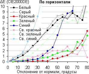 В качестве реперной точки можно выбрать отклонение в 45°, что может быть актуальным в случае, например, если изображение на экране рассматривают два человека одновременно. Критерием сохранения правильности цветов можно считать значение ΔE меньше 3. Из графиков следует, что чистые красный и зеленый цвета меняются несильно, а синий и светлые оттенки претерпевают значительные изменения.