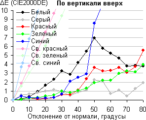 Для количественной характеристики изменения цветопередачи мы провели колориметрические измерения для белого, серого (127, 127, 127), красного, зеленого и синего, а также светло-красного, светло-зеленого и светло-синего полей во весь экран с использованием установки, подобной той, что применялась в предыдущем тесте. Так как свойства TN-матрицы фактически симметричны относительно вертикальной оси, то для экономии времени измерение цветового сдвига выполнялось только при отклонении вверх, вниз и вправо. Измерения проводились в диапазоне углов от 0° (датчик направлен перпендикулярно к экрану) до 80° с шагом в 5°. Полученные значения интенсивностей были пересчитаны в отклонение ΔE относительно замера каждого поля при перпендикулярном положении датчика относительно экрана. Результаты представлены ниже: