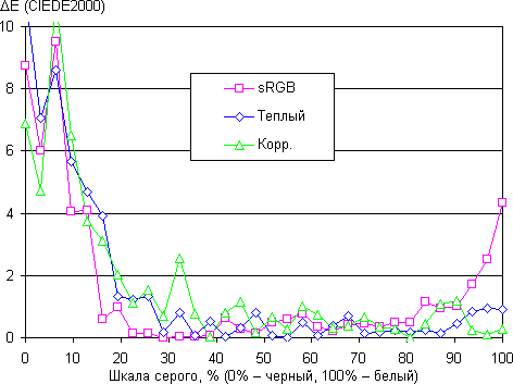 Компоненты цветов имеют характерный для устройств со светодиодными источниками вид с широкими полосами. Цветопередача даже при выборе профиля sRGB несколько отличается от стандартной, поэтому мы попытались вручную скорректировать цвета, регулируя усиление трех основных цветов. Графики ниже показывают цветовую температуру на различных участках шкалы серого и отклонение от спектра абсолютно черного тела (параметр ΔE) в случае профиля sRGB, Теплый и после ручной коррекции: