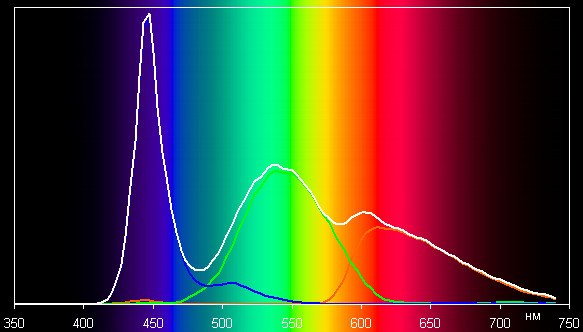 Впрочем, отклонения координат зеленого цвета от вершины sRGB не очень большое, поэтому визуально цвета на этом мониторе имеют естественную насыщенность. Ниже приведен спектр для белого поля (белая линия), наложенный на спектры красного, зеленого и синего полей (линии соответствующих цветов).