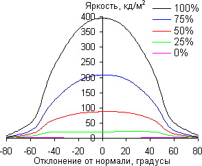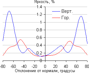 Отметим плавное уменьшение яркости при отклонении от перпендикуляра к экрану в горизонтальном направлении, при этом графики не пересекаются во всем диапазоне измеряемых углов. При отклонении вниз темные оттенки инвертируются, при отклонении вверх инвертируются светлые. Контрастность в диапазоне углов ±82° не опускается ниже отметки 10:1.