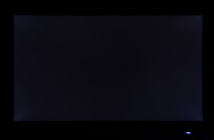 Аппаратные измерения показали отличную равномерность белого поля. Формально равномерность черного поля и, соответственно, контрастности не очень высокая, но абсолютное значение контрастности высокое, что отчасти нивелирует этот недостаток. Визуально черное поле равномерное на большей части площади, и только в углах яркость несколько повышается. Фотография ниже демонстрирует распределение зон с повышенной яркостью черного поля: